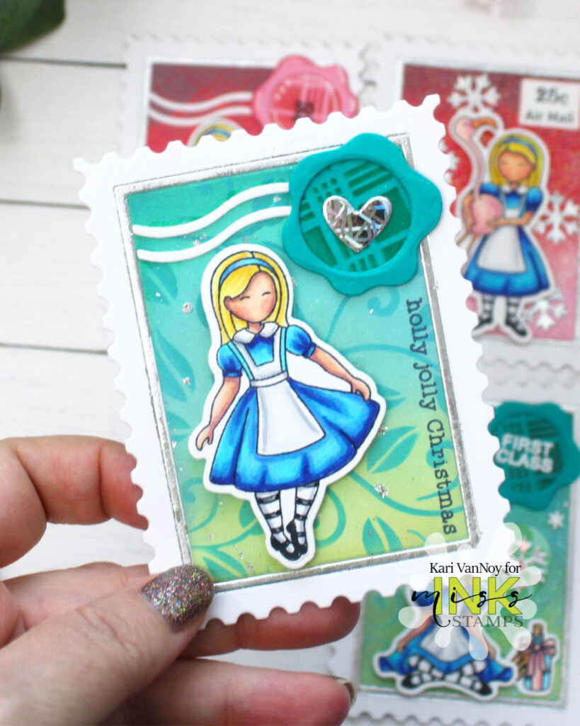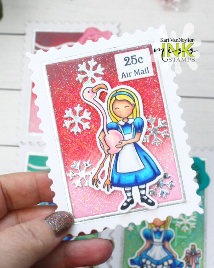 I love creating postage stamps, and these Christmas inspired stamps hold extra glitter and shine! Today I used silver Gilding Flakes, but you could use gold or any color you want! Take a close look at the inside frame of the postage stamp….that’s where I added the silver gilding flakes. So beautiful.