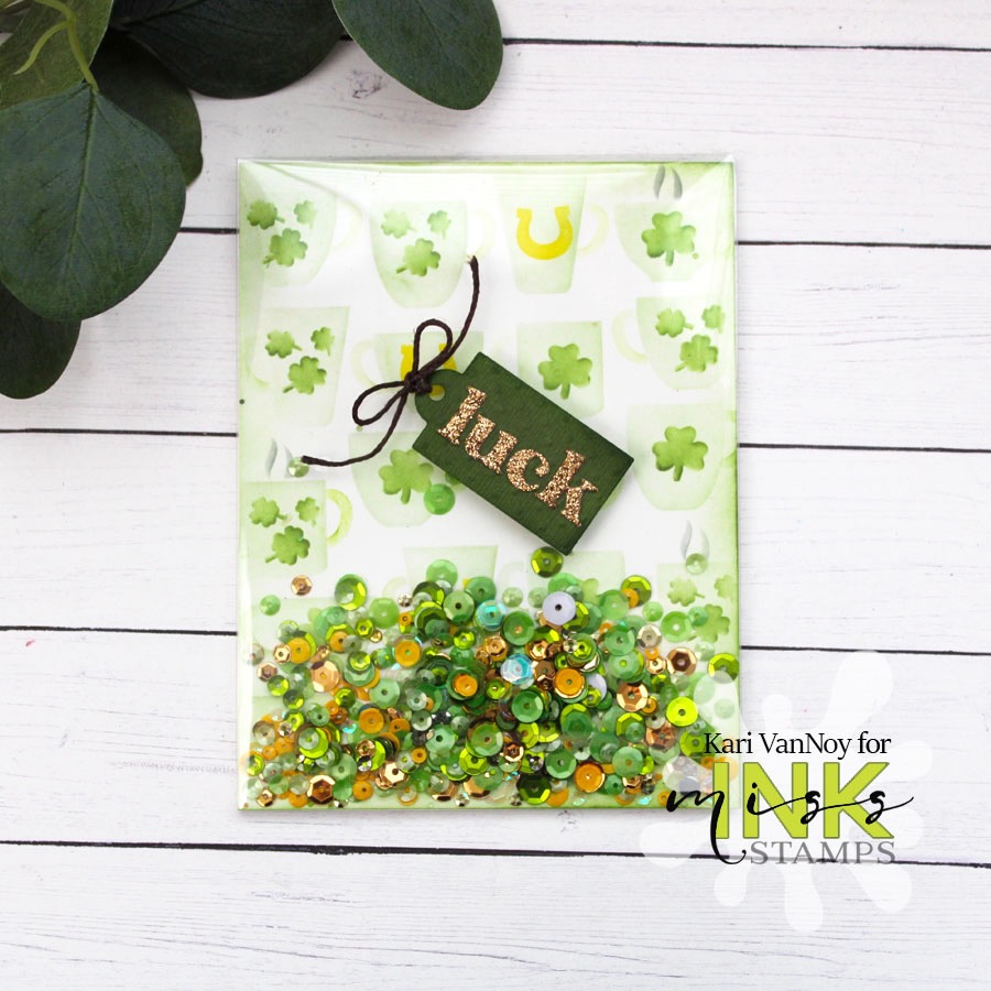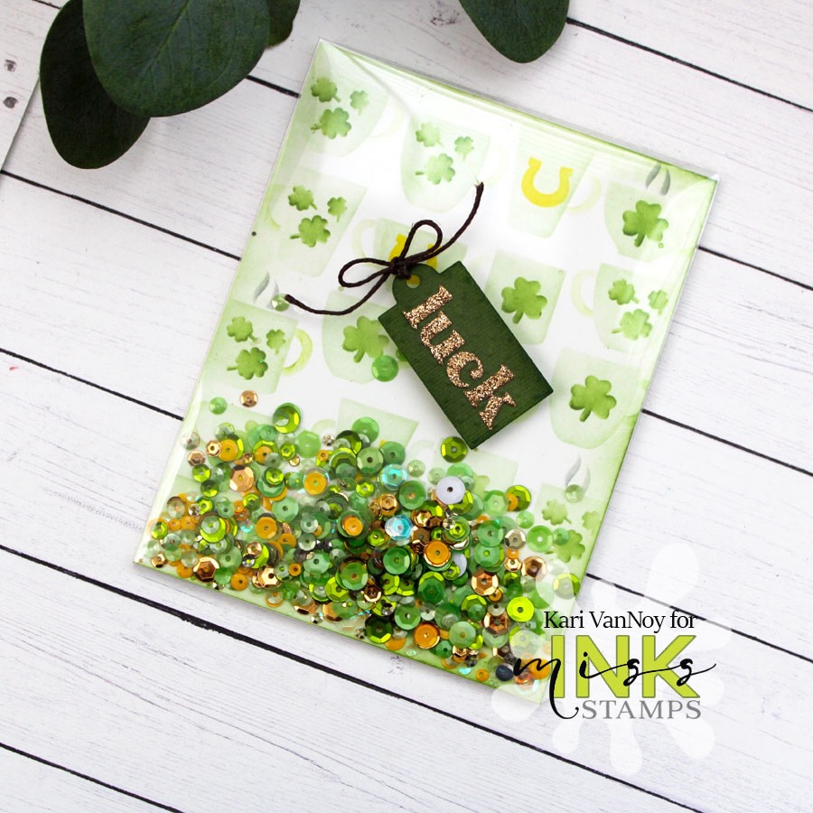 I started by stenciling the Hug in a Mug stencil and adding the clovers & shamrocks with the Holiday Icons stencil. Then I cut the acetate from the Postage Seal & Shaker Collection dies. This is how I created my own full panel shaker…and it makes a perfect card front! (it’s so nice and flat, too…which is why I love creating my own)