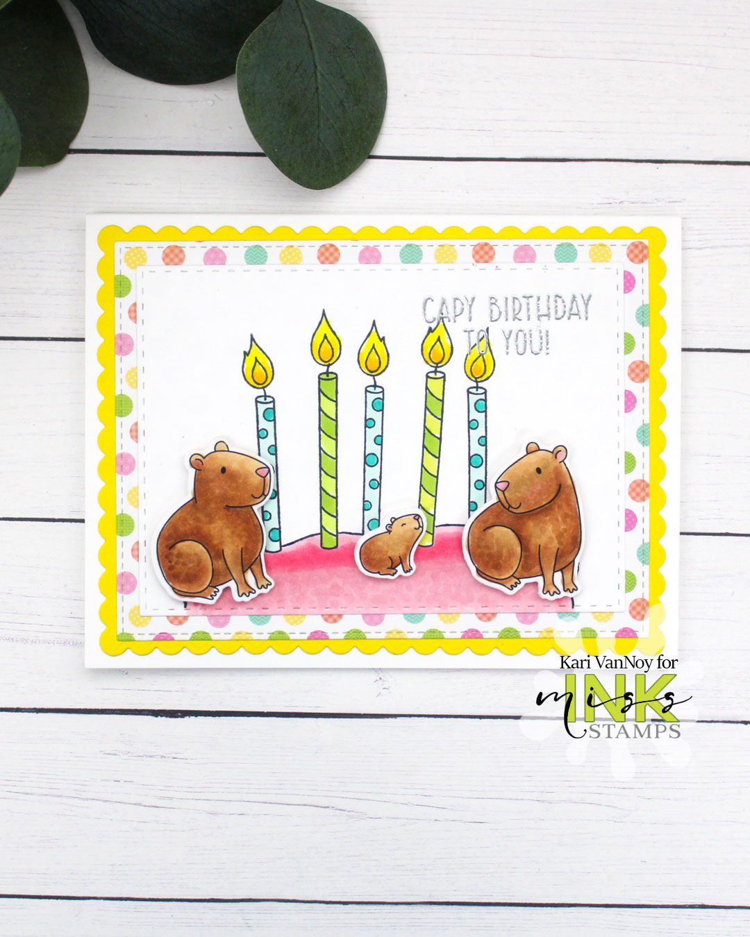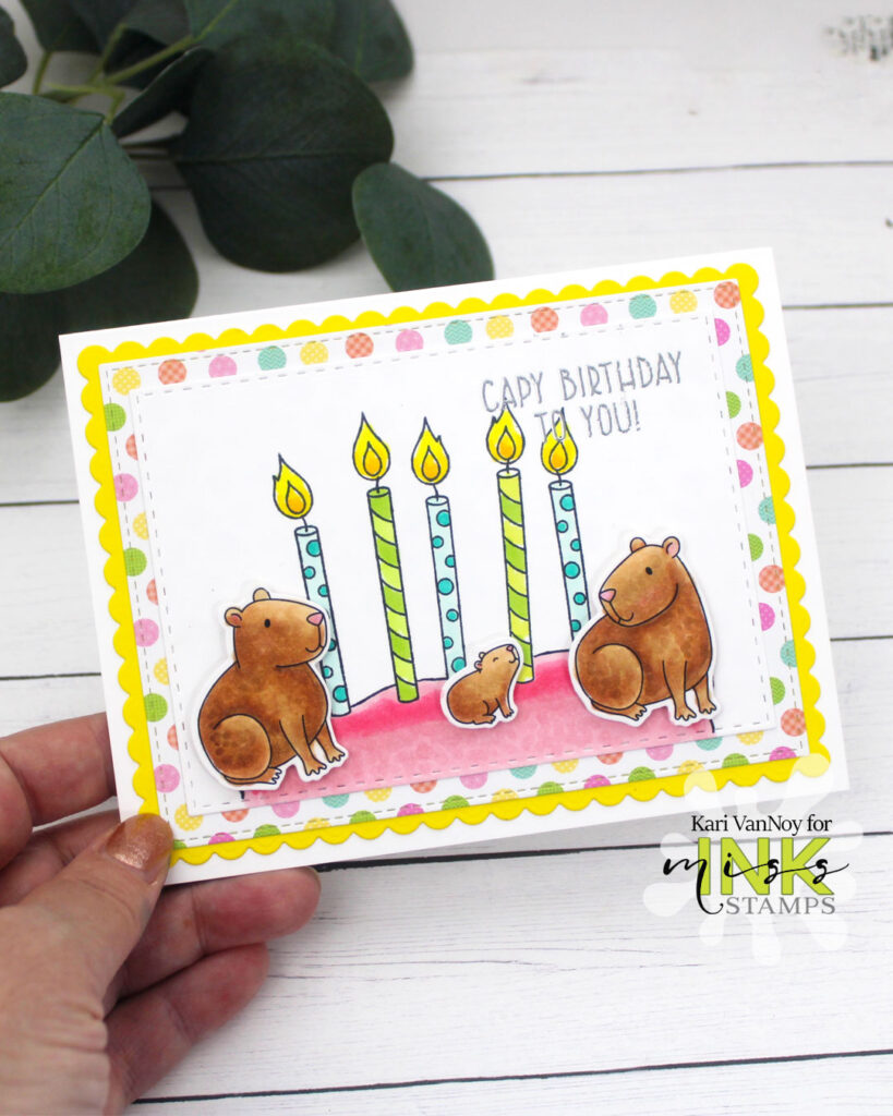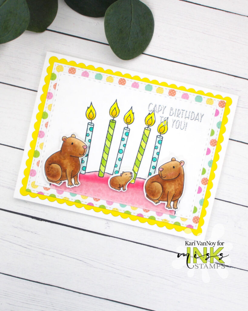 I love the Oh Capy Day stamp set from Miss Ink Stamps! There is a pond stamp in there that worked perfectly as a make-shift CAKE for this card! Its a great way to stretch your stamps.